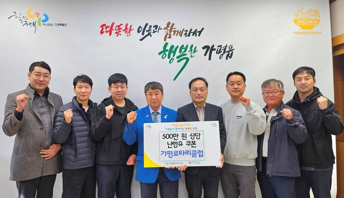 가평로타리클럽이 13일 가평읍 행정복지센터를 찾아 500만 원 상당의 난방유 쿠폰을 전달하며 지역사회 나눔활동을 이어갔다. 이번 기탁은 겨울철 취약계층 가구의 난방비 부담을 덜어주고자 이뤄졌다.