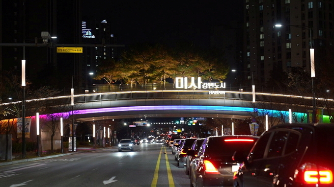 새 조명 시스템은 도시 브랜드를 강조하는 연출이 특징이다. 다리 상부에는 ‘미사강변도시’ 로고와 연계된 무지개빛 라인 조명이 설치됐다.