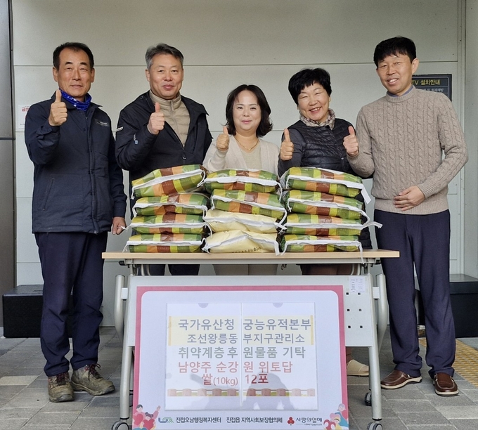 남양주시는 26일, 국가유산청 조선왕릉동부지구관리소가 진접읍 내각리에 위치한 순강원의 위토답에서 직접 수확한 쌀 10㎏ 12포를 진접읍 지역사회보장협의체에 기탁했다고 밝혔다.