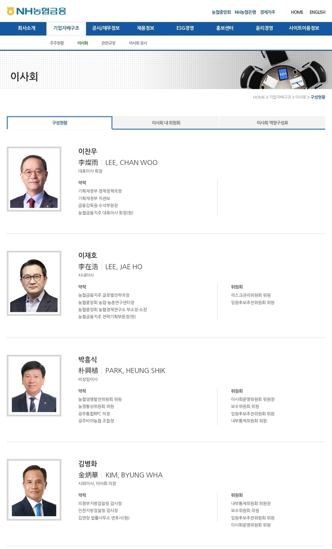 NH농협금융지주가 이사회 공시에서 이미 직위를 상실한 박흥식 전 광주 비아농협 조합장을 ‘현직 조합장’처럼 기재한 사실이 확인됐다. 박 전 조합장은 위탁선거법 위반으로 벌금 300만 원이 확정돼 지난 6월 조합장직을 잃었지만, 농협금융 홈페이지의 이사회 약력에는 여전히 현직으로 표기돼 있었다는 것이다.