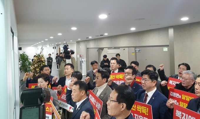 국민의힘 도의원들은 도지사실 앞에서 ‘복지예산 싹둑! 도민은 지옥문!’, ‘복지예산 실종! 추경 NO! 본예산 YES!’, ‘김동연의 달달버스 민생은 덜덜버스’라고 적힌 피켓을 들고 갈등 해결에 적극적인 모습을 보이지 않고 있는 김 지사를 규탄했다.