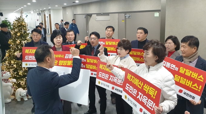 국민의힘 도의원들은 2일 도의회 1층 로비에서 기자회견을 열고 도의 내년도 복지사업 예산 삭감 편성, 도지사 비서실·보좌기관의 행정사무감사 불참석 등을 규탄했다.