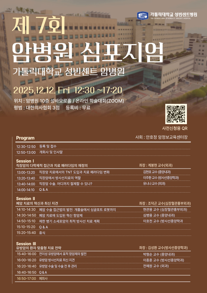 이번 심포지엄은 대한의사협회 연수평점 3점이 부여되며, 온·오프라인으로 동시 진행된다. 관련 문의는 성빈센트병원 경영지원팀으로 가능하다.