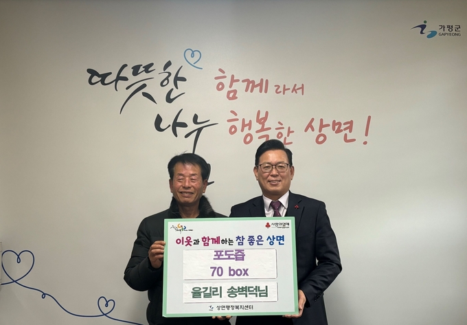 서태원 상면장은 "어려운 가운데서도 직접 재배한 포도로 만든 포도즙을 기탁해주신 송병덕님께 진심으로 감사를 드린다"며 "이번 나눔은 우리 지역공동체가 서로 배려하고 협력하는 문화를 확산하는 데 큰 힘이 될 것이다"라고 전했다.