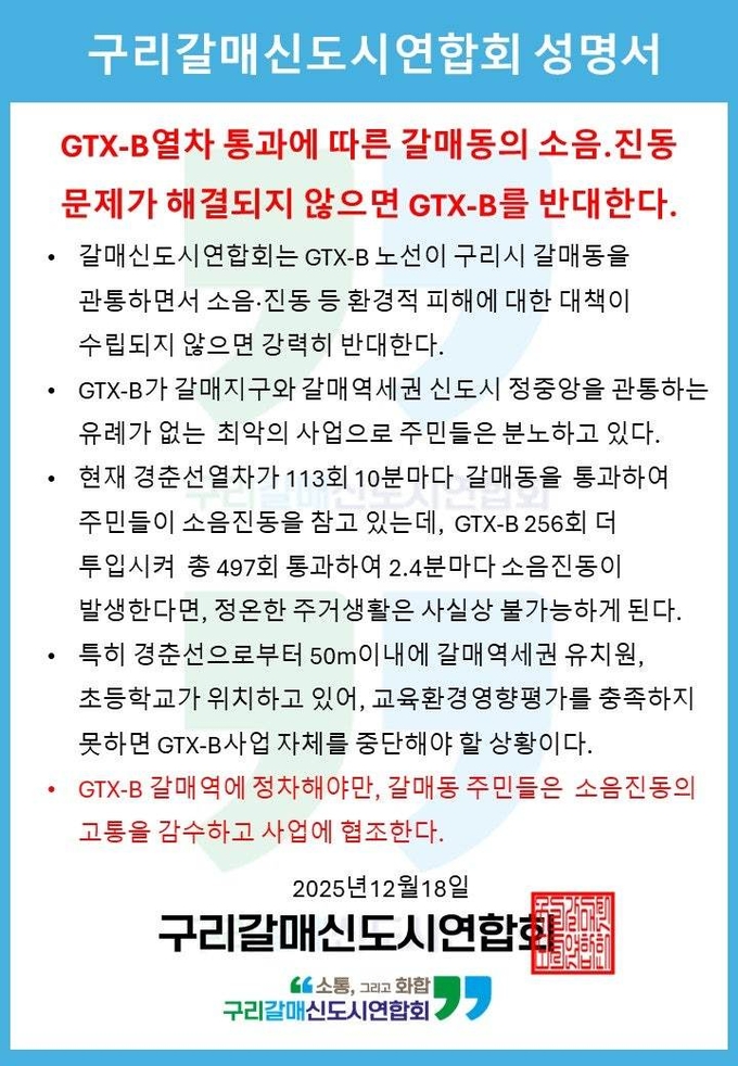 이상천 갈매신도시연합회장은 "우리는 GTX-B 사업의 성공을 원한다. 다만 그 전제는 갈매동 주민들에게 일방적인 희생을 강요하지 않는 것"이라며 "정차 여부를 합리적으로 정리하지 않은 채 사업을 밀어붙인다면, 재정 부담, 환경 문제, 보건 문제까지 복합적인 사회적 논쟁으로 확산될 수밖에 없다"고 밝혔다.