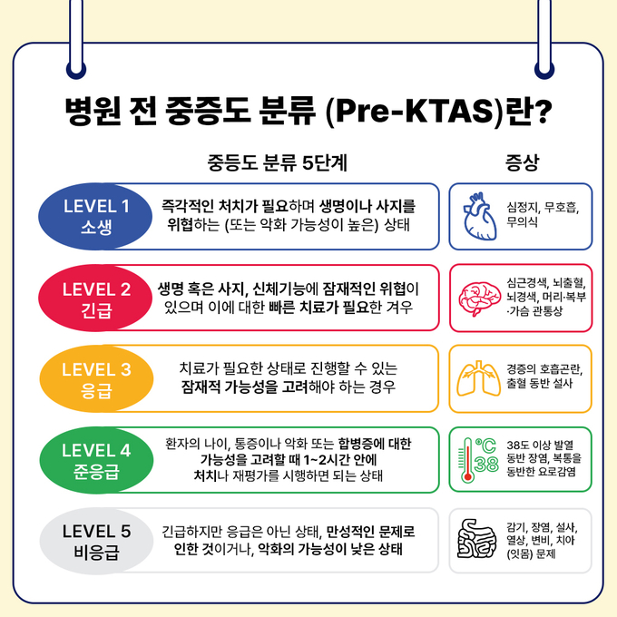 소방서 관계자는 환자의 중증도분류를 구급대원이 현장에서 “환자 의식수준을 비롯해 활력징후, 외상정도, 증상의 급성도 등을 종합적으로 평가하여 환자의 상태를 1~5단계로 나누는 과정을 선정한다”고 말했다.