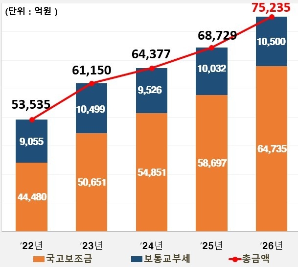 보통교부세는 1조 500억 원으로, 전년(1조 32억 원) 대비 468억 원(4.7%) 증가하며 역대 최대치를 기록했다. 보통교부세 총 재원이 전년 대비 2.1% 증가한 것과 비교하면 증가율은 두 배 이상으로, 재정 대응 노력이 반영된 결과로 평가된다.