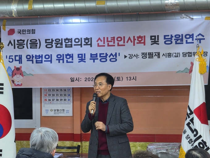 정필재 시흥갑 당원협의회 위원장의 강의를 통해 ‘사법체계를 파괴하는 5대 악법’을 주제로 한 시국 인식 공유가 이뤄졌다. 정 위원장은 현 정부·여당의 입법 독주를 강하게 비판하며, 민주주의의 핵심 가치인 견제와 균형이 심각하게 훼손되고 있다고 지적했다.
