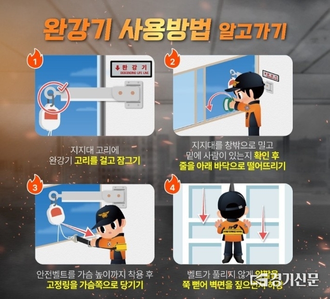 안성소방서는 완강기 사용 시 ▲창문 개방 및 지지대 설치 ▲후크와 속도조절기 결속 ▲지지대 고정 ▲로프 하강 준비 ▲안전벨트 착용 ▲벽면을 짚으며 천천히 하강하는 절차를 반드시 지켜야 한다고 당부했다.