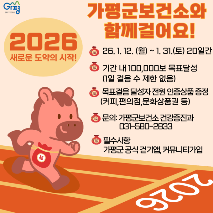 가평군 보건소가 '2026년 보건소와 함께 걸어요!'를 주제로 건강 걷기 프로그램을 운영하며 새해 걷기운동 실천을 독려한다.