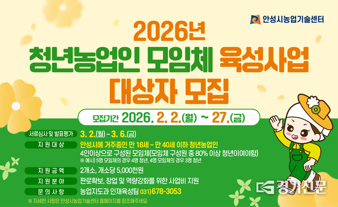 이번 사업은 청년농업인 간 교류를 활성화하고, 모임체의 판로 확보와 창업 기반 조성, 농산물 홍보를 지원하기 위해 추진된다. 안성시에 거주하는 청년농업인 가운데 1986년 1월 1일 이후 출생자로 구성된 4인 이상 모임체라면 신청할 수 있다.