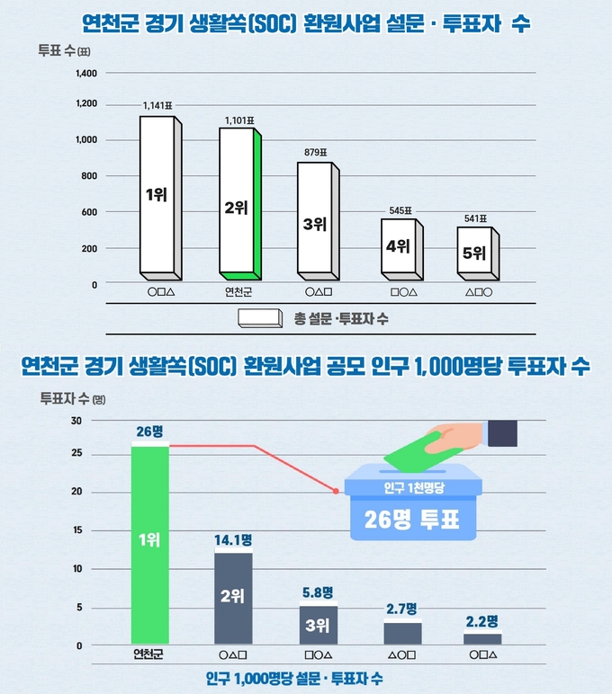 연천군은 경기도가 추진한 '경기 생활쏙(SOC) 환원사업' 오디션 공모 설문·투표 최종 집계 결과, 전체 8189명의 참여자 중 1101명이 투표해 인구수 대비 투표율에서 압도적 1위를 기록했다고 밝혔다.