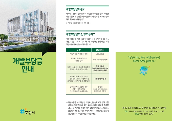 포천시는 토지 개발사업 시 발생하는 개발부담금 제도에 대해 알기 쉽게 정리한 홍보물을 제작해 시 관내 소재한 공인중개사사무소, 측량설계사무소, 행정사사무소, 인허가와 관련된 모든 부서에 배부했다고 26일 밝혔다.