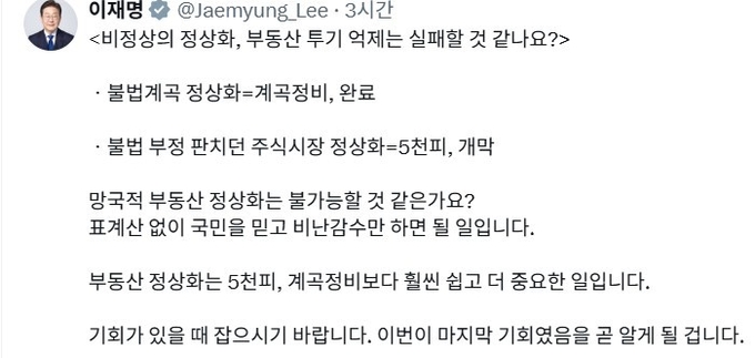 이재명 대통령은 31일 “망국적 부동산 정상화는 불가능할 것 같은가요?”라며 “표 계산 없이 국민을 믿고 비난을 감수하면 될 일”이라며 부동산 정상화에 대한 의지를 밝혔다.