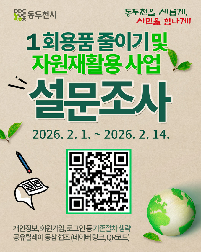 동두천시는 깨끗한 도시환경 조성을 위해 추진 중인 1회용품 줄이기 및 자원 재활용 사업시민 설문을 실시한다.