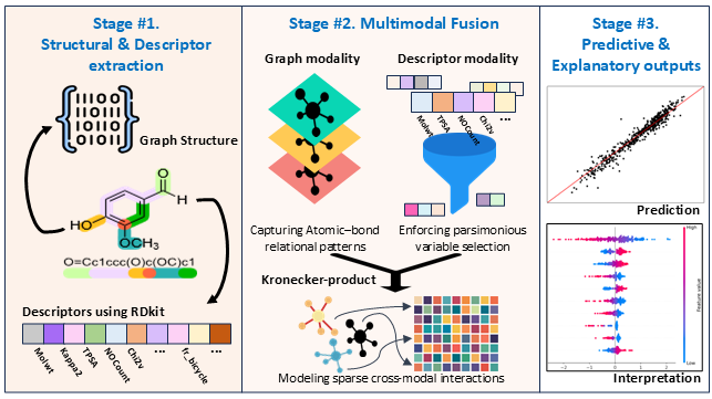 이번 연구인 ‘분자 물성 예측을 위한 통계적 간결한 변수 선택 기반 멀티모달 그래프 융합(Multimodal Graph Fusion with Statistically Guided Parsimonious Descriptor Selection for Molecular Property Prediction)’에서는 분자 구조와 화학적 정보를 결합해 분자 특성을 예측하는 인공지능 기법을 제안했다.