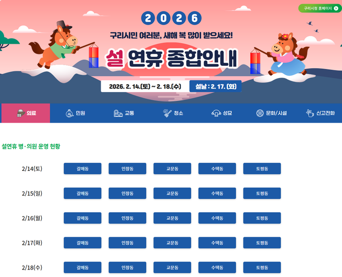 구리시는 2026년 설 명절 연휴기간을 맞아 오는 14일부터 18일까지 시민들을 위한 종합안내 누리집을 제공한다고 13일 밝혔다.