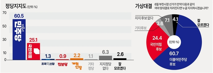 차기 부천시장 선거에서 민주당, 국민의힘 후보가 맞붙을 시 누구를 지지할지 묻는 질문에는 응답자 60.7%가 민주당을 선택하겠다고 답했다.