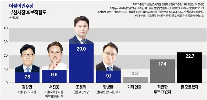 오는 6월 3일 실시하는 제9회 전국동시지방선거 부천시장 더불어민주당 후보 여론조사에서 조용익 현 부천시장이 오차범위(±4.4%p) 밖에서 지지도 선두를 달리고 있는 것으로 나타났다.