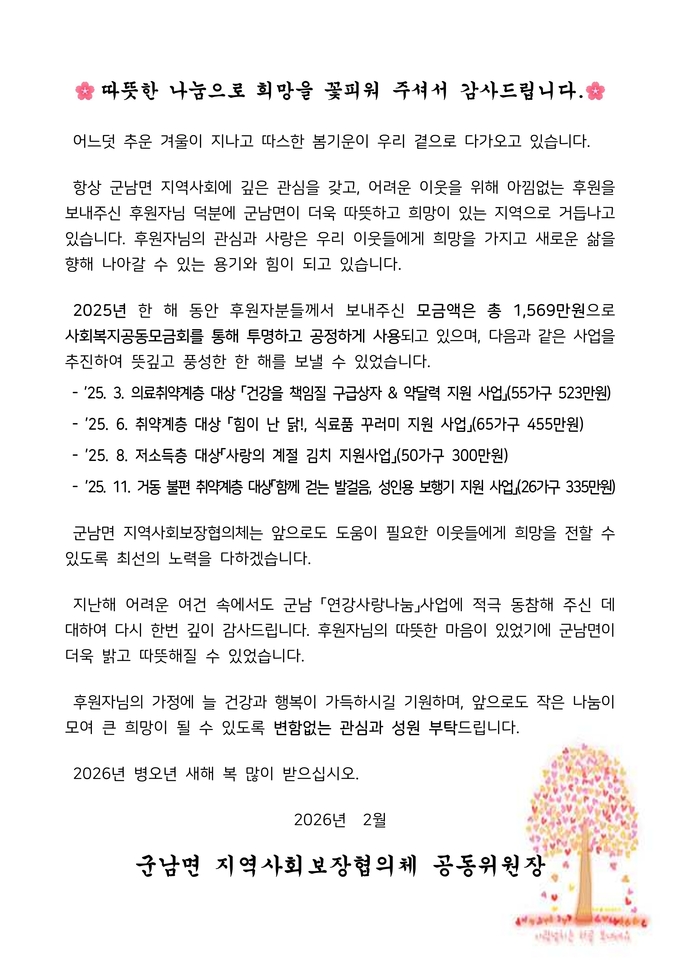 송미순 민간위원장은 “어려운 이웃을 외면하지 않고 꾸준히 손을 내밀어 주신 후원자 여러분께 깊이 감사드린다”며 “이번 감사 서한문이 나눔 문화 확산과 따뜻한 공동체 형성에 기폭제가 되길 바란다"고 말했다.
