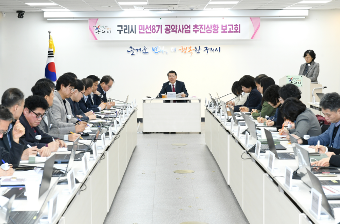 구리시는 지난 26일 시청 상황실에서 ‘민선 8기 공약사업 추진 상황 보고회’를 개최하고, 그간의 공약 이행 성과를 점검하는 한편 진행 중인 사업의 향후 추진계획을 집중적으로 논의했다.