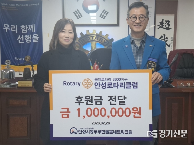 국제로타리 3600지구 안성로타리클럽이 지난 26일 안성시동부무한돌봄네트워크팀에 후원금 100만 원을 전달하며 지역 복지안전망 강화에 힘을 보탰다.