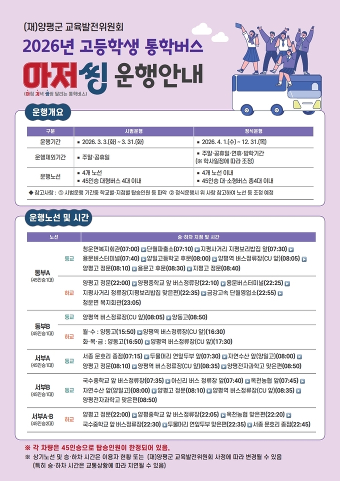 통학버스는 오는 3일부터 연말까지 토.일요일과 공휴일을 제외한 평일에 운행된다. 운영 노선은 ▲서종-양평 1대 ▲청운·단월·지평·용문-양평 1대 ▲옥천-양평 1대 ▲양동-양평 1대 등이다.