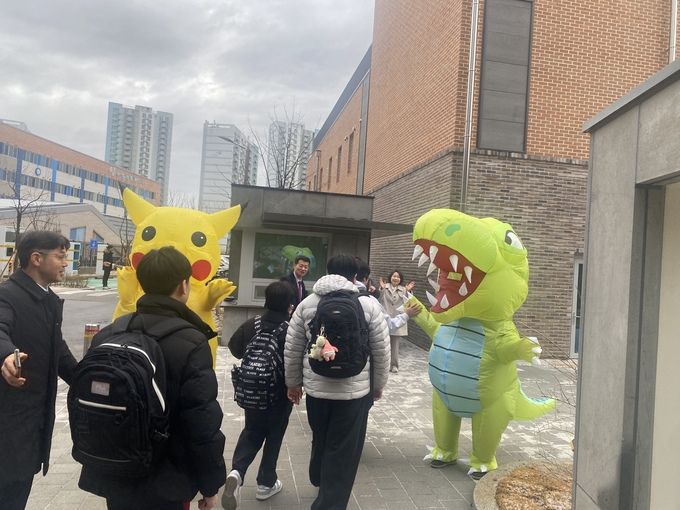등교맞이는 임정모 교육장을 비롯, 학교 구성원 대표인 연강흠 초대 교장, 서주연 교감, 정신영 행정실장이 교육지원청 직원들과 함께했다.