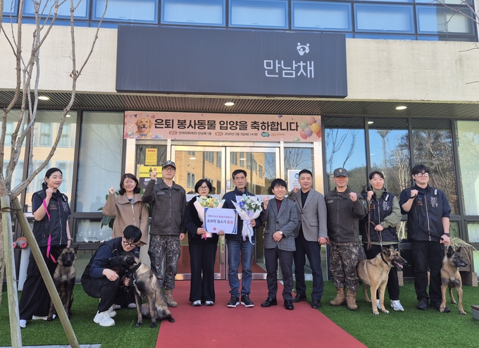 이날 축하식에는 지난달 26일 반려마루 여주로 새로 데려온 은퇴군견 2마리도 동반 참석했다. 모두 정찰견으로 활동하다 은퇴했으며 사전에 사람과의 친화도, 반려견으로서의 품성을 심사해 선발된 민간분양 대상견이다.