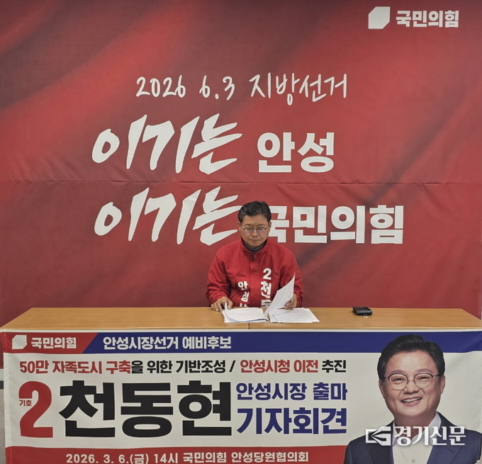 천 후보는 지난 6일 국민의힘 안성시당원협의회 사무실에서 기자회견을 열고 출마 선언과 함께 안성의 구조적 변화를 이끌 핵심 공약을 공개했다.