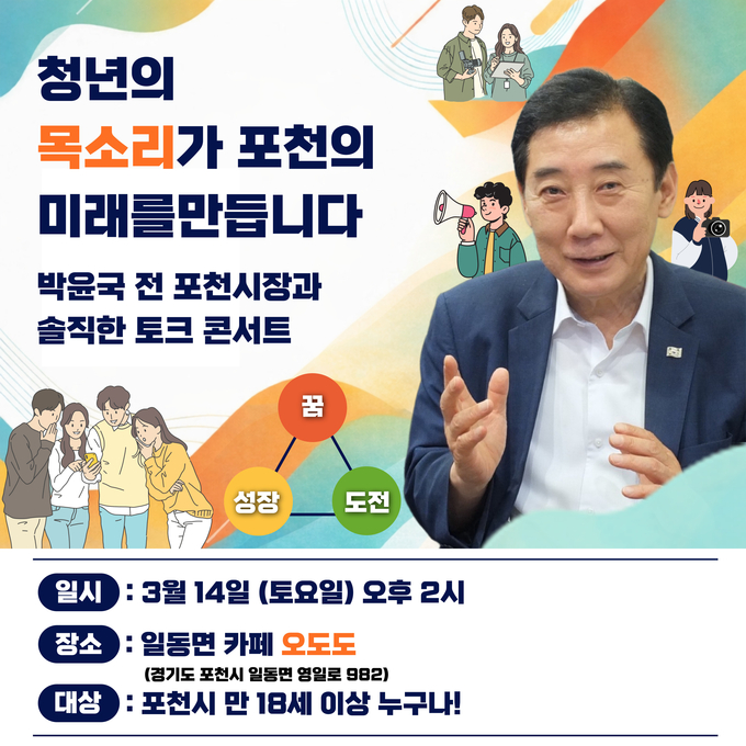 더불어민주당 박윤국 포천시장 예비후보는 오는 14일 오후 2시 일동면 카페 오도도(포천시 영일로 982)에서 지역 청년들과 토크 콘서트를 개최할 예정이라고 밝혔다.
