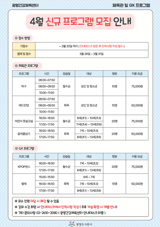 광명도시공사는 광명건강체육센터에서 시민들의 건강 증진과 생활체육 활성화를 위해 체육관 및 GX실 4월 신규 프로그램 회원을 모집한다고 17일 밝혔다.