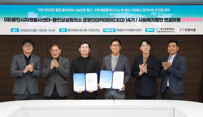 용인특례시는 지난 17일 시청 접견실에서 용인시자원봉사센터가 용인상공회의소 경영인 아카데미(CEO) 14기와 사회복지법인 연꽃마을과 각각 업무협약을 체결했다고 18일 밝혔다.
