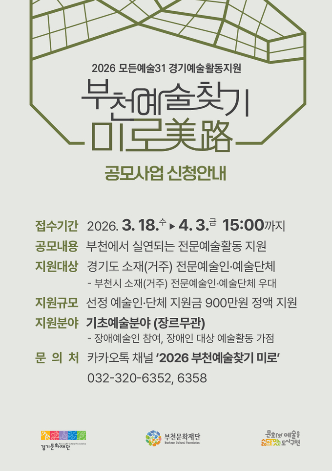 부천문화재단이 지역 전문예술인의 창작활동을 지원하고 시민의 문화 향유 기회를 확대하기 위해 ‘2026 모든예술 31 경기문화예술활동지원 '부천예술찾기 미로(美路)' 공모를 실시한다.
