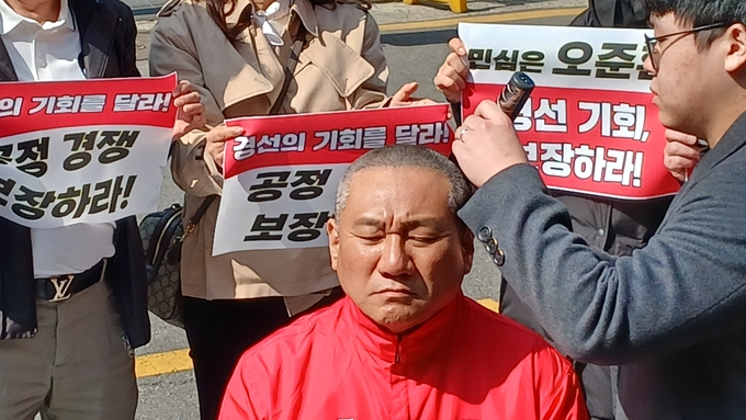 국힘 당내 경선 배제에 강력하게 항의하는 의미로 오 후보는 24일 서울 여의도 당사 앞에서 삭발식을 거행했다.