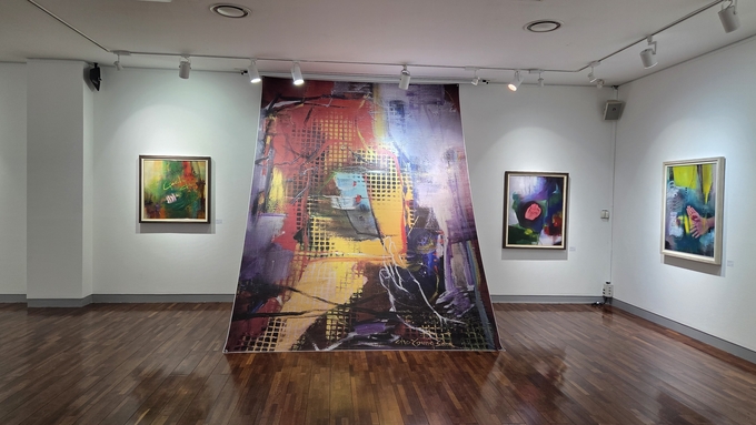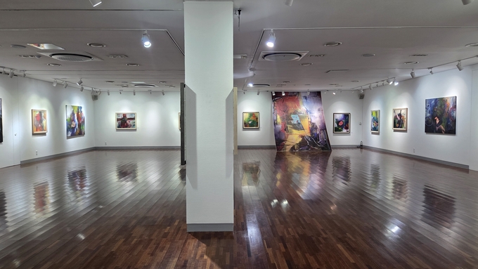 전시실에 들어서면 회화 작품과 거대한 천 위에 그려진 작품들이 눈에 들어온다.