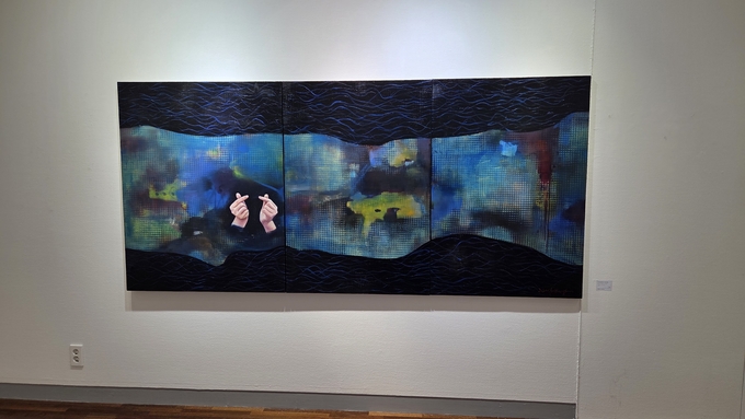 대형 캔버스 세 개가 합쳐진 '하이브리드의 디오라마'는 푸른 색감을 중심으로 오묘한 배경 속 손하트의 모습은 이질적이면서도 익숙한 풍경을 드러낸다.