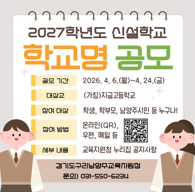 구리남양주교육지원청은 2027년 개교 예정인 가칭 지금고등학교(남양주시 다산동 6210) 1교에 대한 학교명을 공모한다고 2일 밝혔다.