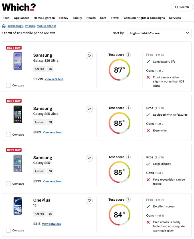 영국에서는 S26 울트라가 총점 87점으로 스마트폰 랭킹에서 1위를 기록했고 S26만의 새로운 ‘프라이버시 디스플레이’ 보안 성능 부문에서 높은 평가를 받았다.