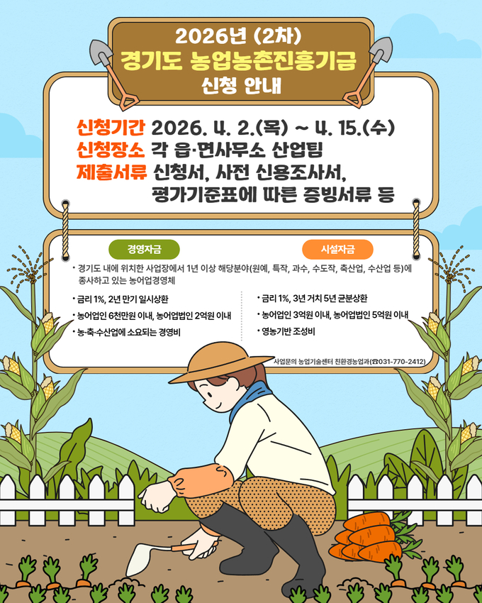 양평군은 농어업인의 소득향상과 삶의 질 개선, 경영안정을 도모하고 농업경쟁력 강화를 위해 '2026년 경기도 농업농촌진흥기금 경영 및 시설자금 지원' 2차 대상자를 모집한다고 밝혔다.