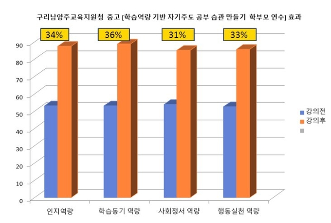 특히 4회차 전체 연수에서 만족도가 98% 이상으로 나타났으며, 중·고등 학부모를 대상으로 실시한 사전·사후 인식 조사 결과 학습역량 4개 영역 모두에서 30% 이상 향상되어 연수의 효과가 뚜렷하게 확인됐다.