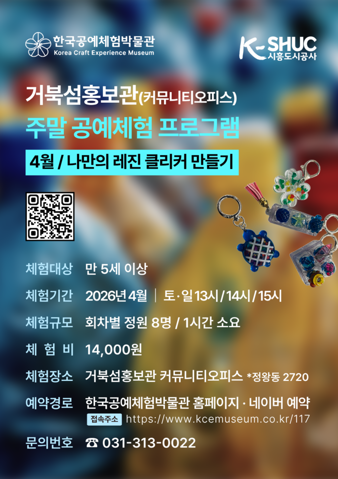 주말에는 가족 단위 방문객을 위한 ‘공예체험 프로그램’을 운영한다. 4월 프로그램은 폐플라스틱을 활용한 ‘나만의 레진 클리커 만들기’로 토요일과 일요일 13시, 14시, 15시 총 3회차로 진행된다.
