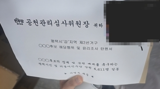 19일 지역 정치권에 따르면 평택시민 및 평택시 더불어민주당 당원 등 4611명은 평택갑 지역 제2선거구에 출마하는 A후보의 징계 및 공천 배제를 촉구하는 윤리 조사 탄원서를 민주당 경기도당에 제출했다.