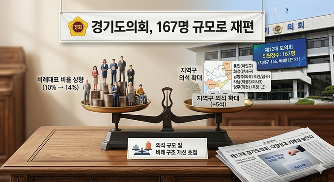 경기도의회가 의석 확대와 비례대표 비율 상향을 반영해 총 167명 체재로 재편된다.