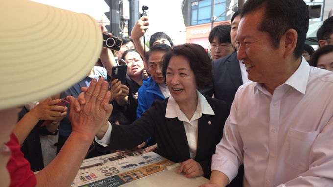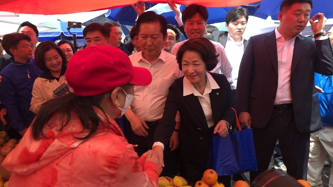 추 후보와 정 대표, 김 후보가 시장 입구에 들어서자 상인들은 손을 흔들며 환대했고, 시민들은 스마트폰을 들어 현장을 담기에 여념이 없었다.