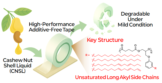 연구팀은 캐슈넛 껍질에서 얻을 수 있는 카다놀(cardanol)을 기반으로 한 새로운 고분자 구조를 설계해 별도의 접착력 보조제 없이도 상용 테이프 수준의 접착 성능을 구현했다. 이 접착제는 온화한 조건에서 빠르게 분해되며 재활용 공정을 방해하지 않는 특성을 보였다.