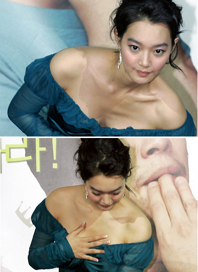 17일 오후 2시 서울 삼성동 메가박스에서 열린 영화 ‘야수와 미녀’(감독 이계벽/제작 시오필름)언론시사회 및 기자간담회에 참석한 주연배우 신민아가 어깨가 드러나는 드레스를 입고 나와 조심스럽게 행동하고 있다.