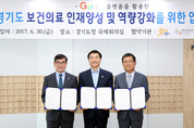 경기도 보건의료 인재양성 및 역량강화 업무협약 체결식이 지난달 30일 도청 국제회의실에서 열려 이재율 경기도 행정1부지사(가운데)가 최영현 한국보건복지인력개발원장(왼쪽), 정영진 경기도병원회 회장과 협약서를 들어보이고 있다./경기도 제공