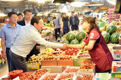 유정복 인천시장이 29일 삼산농산물도매시장을 방문해 상인들을 격려하고 애로사항을 청취하고 있다. /인천시 제공