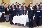 지난 28일 오전 경기도경제과학진흥원 광교홀에서 열린 ‘4월 기우회’에서 남경필 경기도지사와 기우회 회원들이 국민의례를 하고 있다./경기도 제공